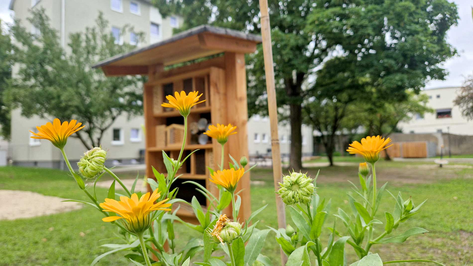 // Die Fläche bietet neuen Lebensraum für Vögel, Insekten, Pflanzen und Kleintiere – und lädt unsere Mietenden zum Entspannen und Mitmachen ein.