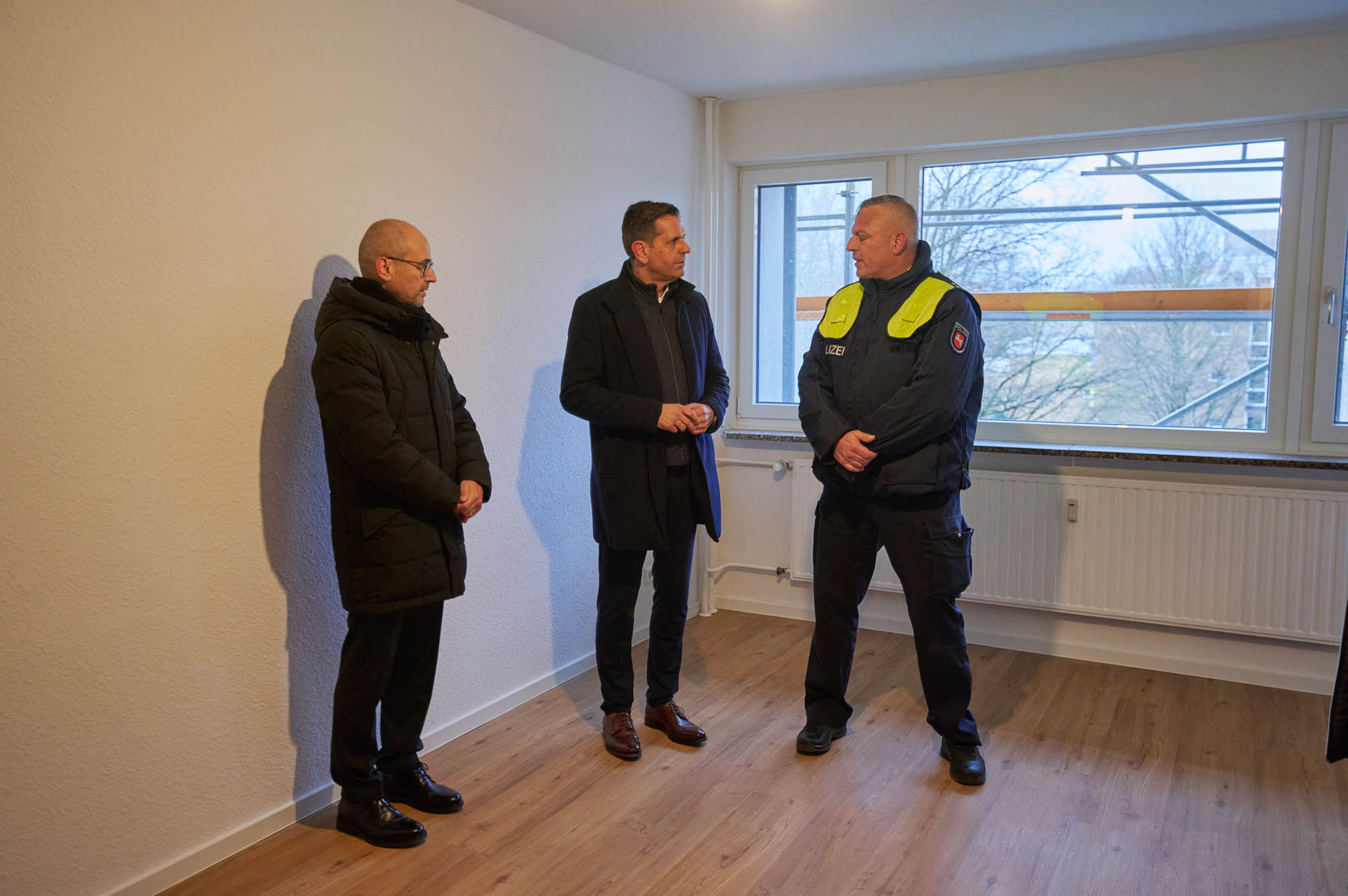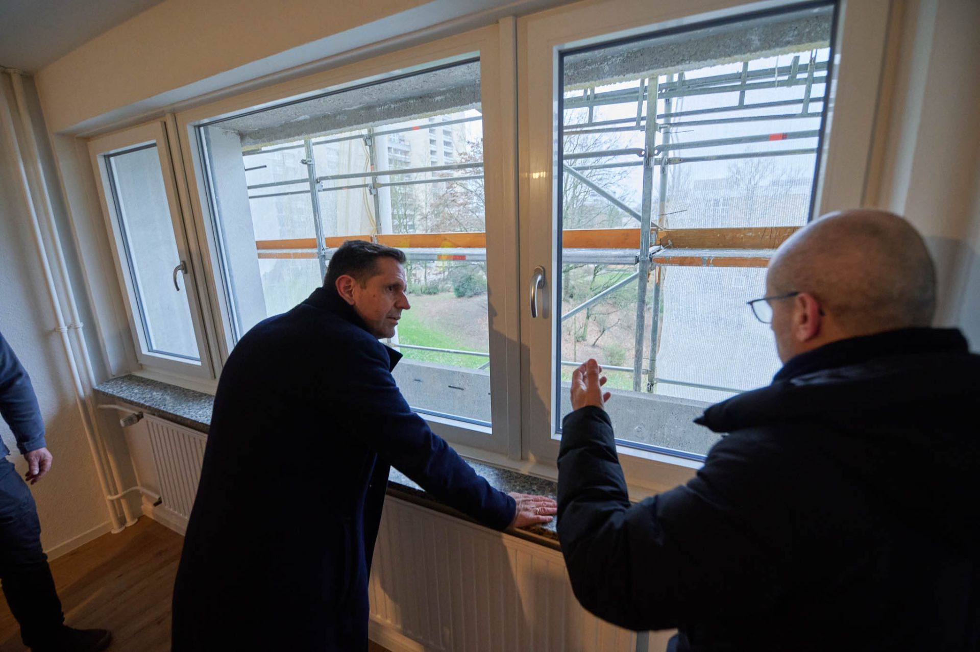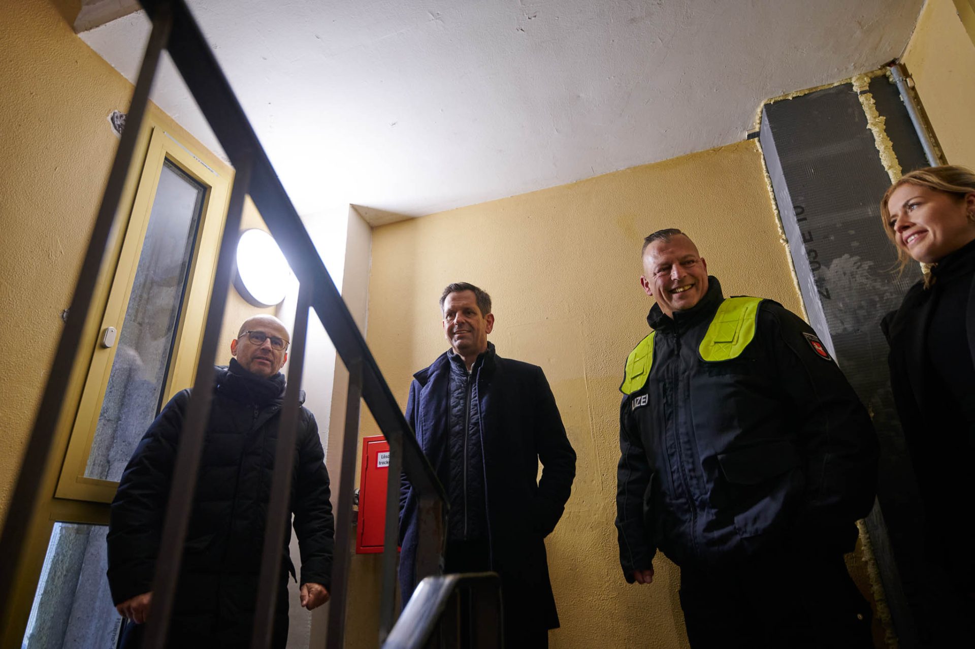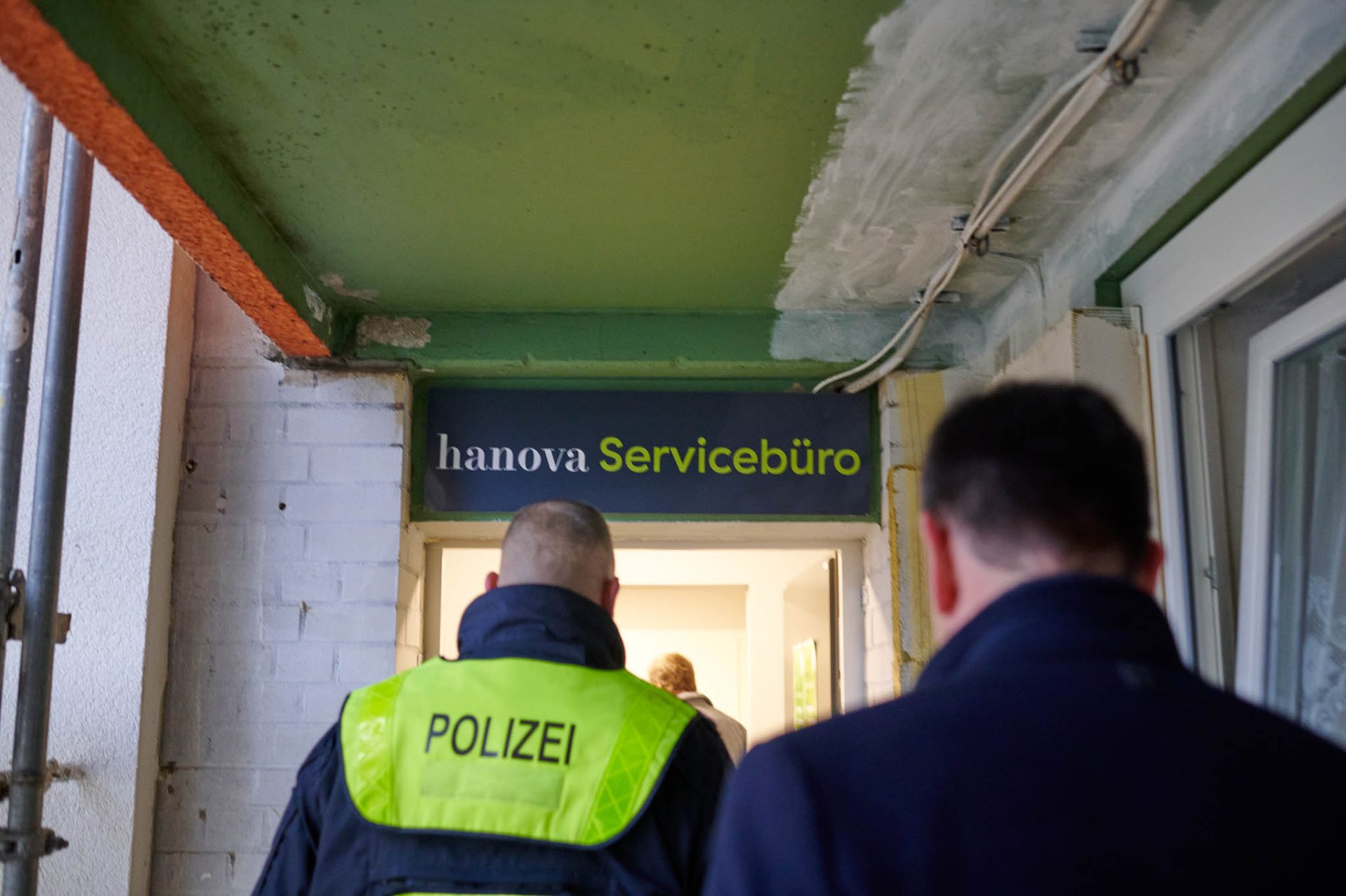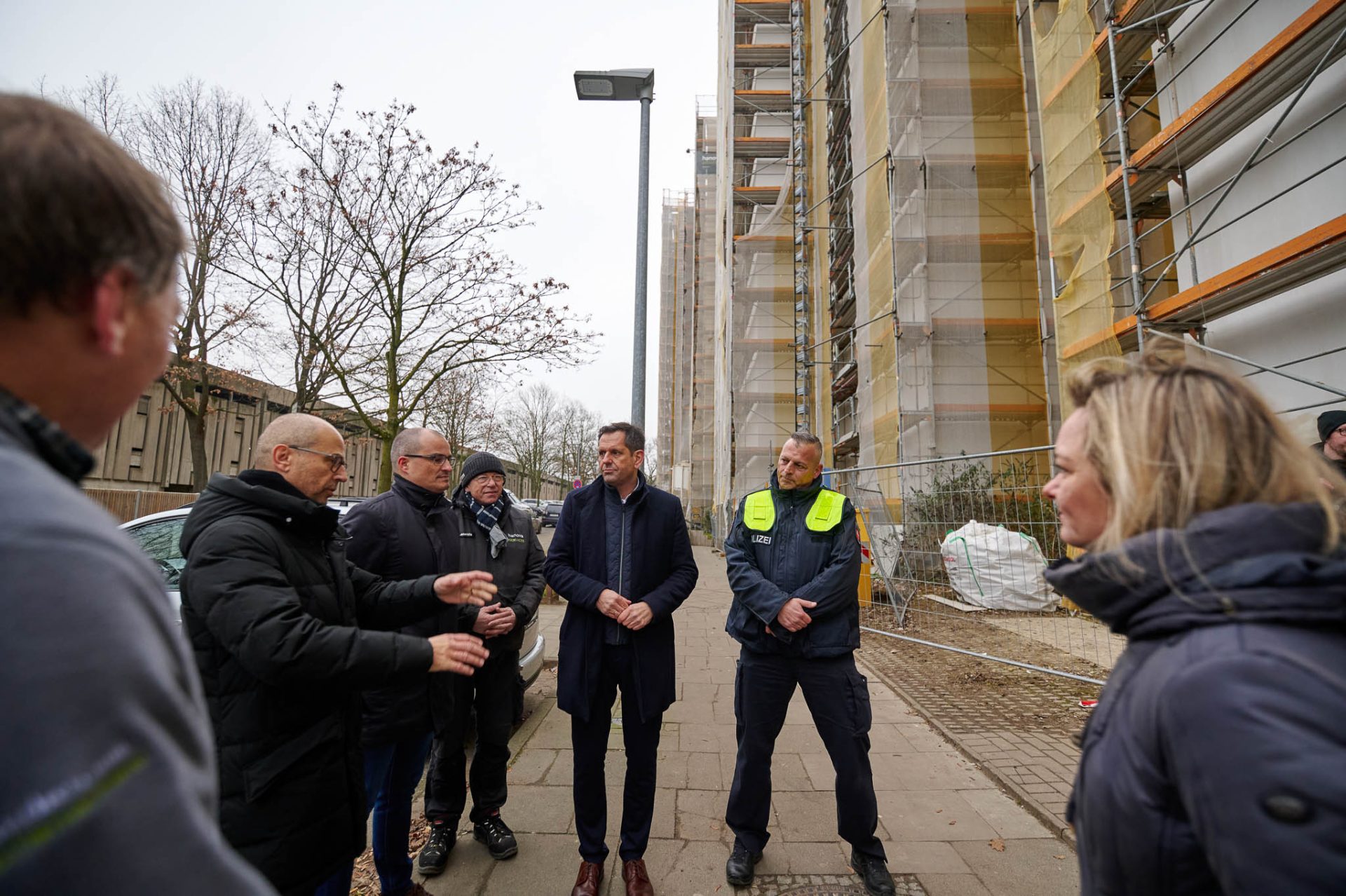 Begleitet wurde der Besuch unter anderem von Karsten Klaus, Geschäftsführer der hanova, die den rund 2.000 Bewohnerinnen und Bewohnern aus über 50 Nationen ein langfristiges Zuhause bietet. Bei einem Rundgang durch den Hochhauskomplex erläuterte Karsten Klaus die umfassenden Sanierungsmaßnahmen und die enge Zusammenarbeit mit Polizei und Quartiersakteuren. Neue Fenster, moderne Dämmung und vollständig sanierte Wohnungen sind sichtbare Zeichen des Wandels.